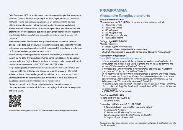 Bartók è sempre stato per me un Autore di riferimento, e in questa nuova fase in cui mi sono trovato ad esprimermi come compositore ho pensato di cercare nelle sue Pagine il conforto di cui ho bisogno nella presentazione di questa prima esecuzione di SUITE 2025
